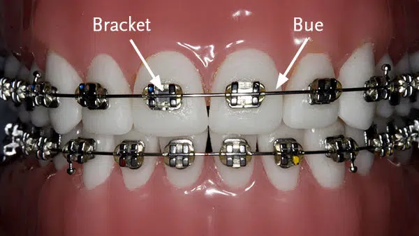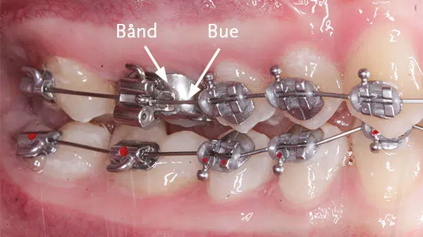 Du har fået fast apparatur. Metal-knapperne der er limet på tænderne kaldes ”brackets”. Det er buen, der retter tænderne.