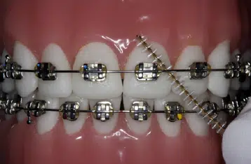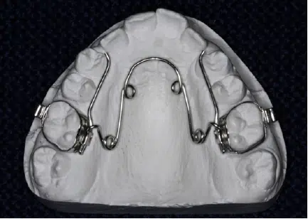 En Quad Helix er limet fast på tænderne ved hjælp af nogle små metalringe bagest i munden.