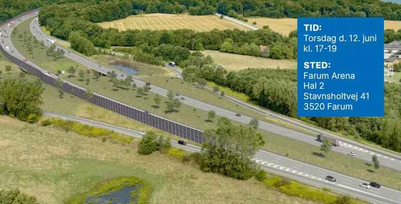 Mødet starter torsdag 12. juni kl. 17, men fra kl. 16 er der mulighed for at komme og snakke med fagfolk fra Vejdirektoratet. Det foregår alt sammen Farum Arena, Hal 2, Stavnsholtvej 41, 3520 Farum.