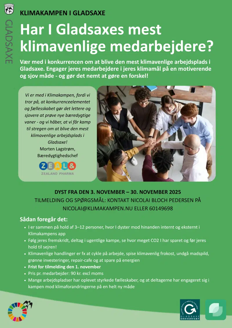 - På en sjov og motivende måde vil gøre det nemt for deres medarbejdere at handle mere bæredygtigt – og konkurrere om at blive den mest klimavenlige arbejdsplads i Gladsaxe!