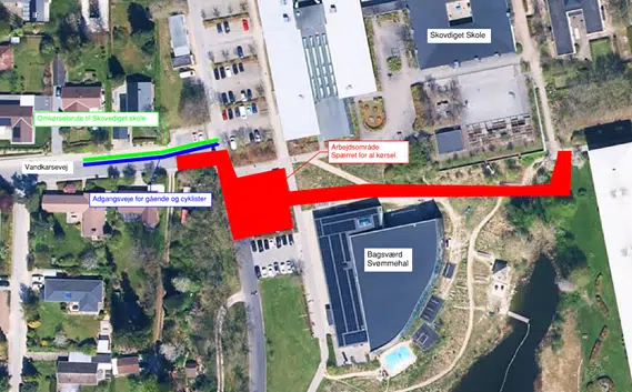 Der er igangværende arbejde med fjernvarme og forsyning til beboelsesområderne omkring Bagsværd Svømmehal. I forbindelse med arbejdet er en del af parkeringsområdet, stisystemet og det grønne område ved svømmehallen afspærret. Adgangen til parkeringsområdet ved Skovbrynet Skole sker via en omkørselsrute.